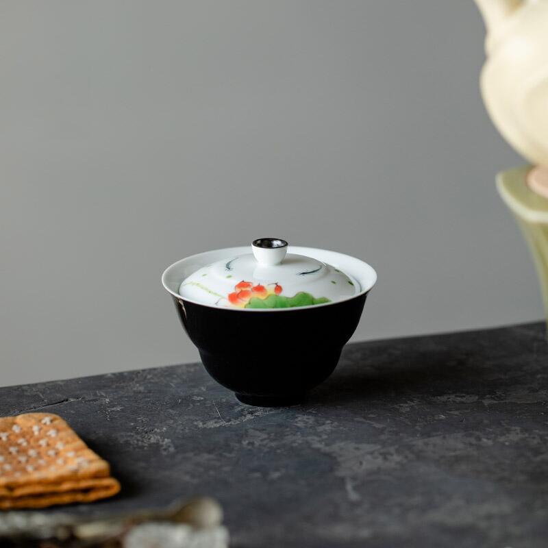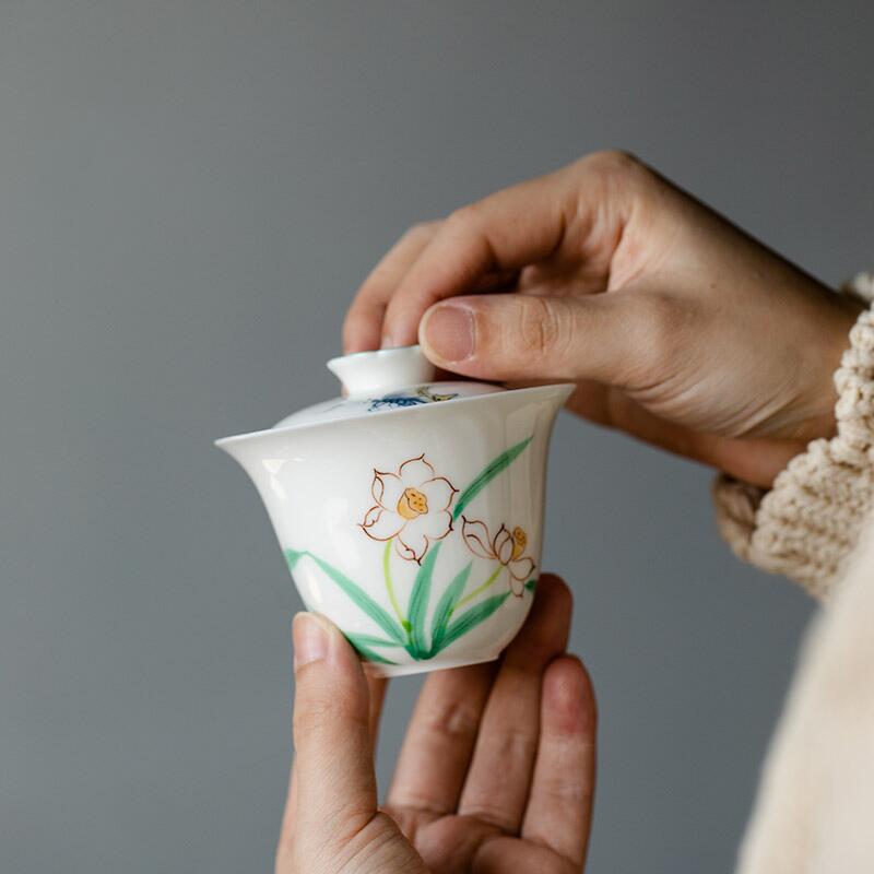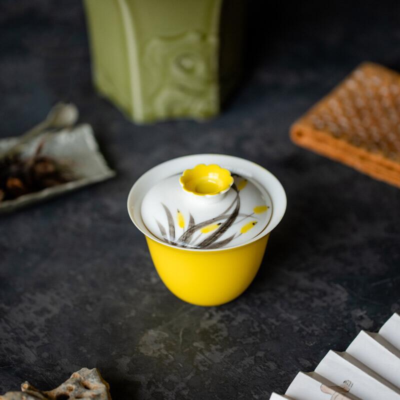 鏡越拓黄手描き蘭馥花蓋碗茶杯単一家庭用創意泡茶碗陶磁器蓋碗茶工夫