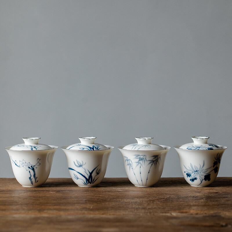 手描きの梅蘭竹菊の白い磁器の蓋の碗のお茶の杯の家庭用の高級な手は銀を描いてお茶の碗の陶磁器の工夫の茶器を入れます。