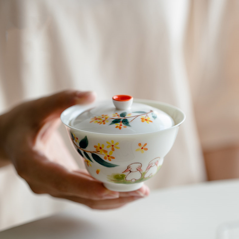 手描き桂花玉兎白磁瓢箪蓋碗秋ウサギ二才陶磁器茶碗パーマ防止兎年茶器単一