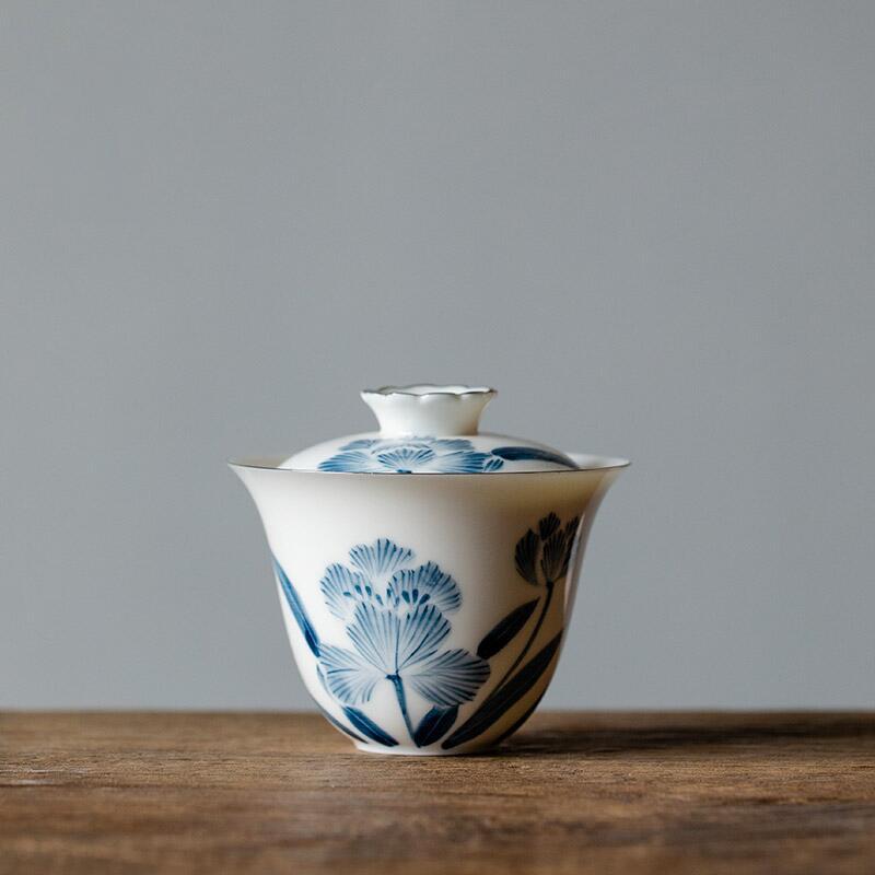 白い磁器の手描きの花の薄い青い蓋の碗のお茶の杯の陶磁器のヒョウタンの茶碗の単一の手を熱くしないで工夫します茶器はお茶の杯を入れます。