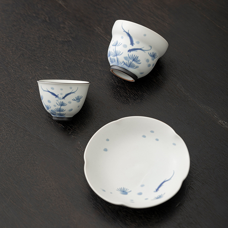游鱼手描きティーカップシングルカップシンプル釉薬下彩家庭用新中国式陶磁器工夫ティーセット品茗杯主人カップ