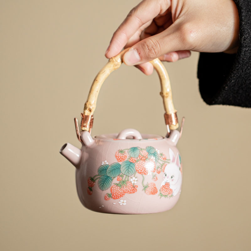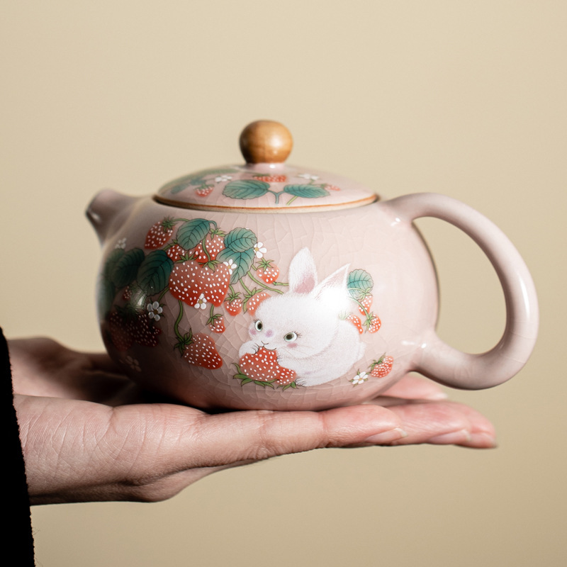 ピンク汝窯提梁壺陶磁器カンフー茶器家庭用創意いちご兎開片可養大容量泡急須
