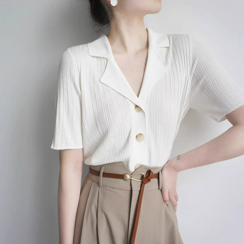女性用アイスシルク半袖シャツ、夏デザイン、ニッチな香りのニットボトムシャツ、トレンディなスタイルの襟トップ