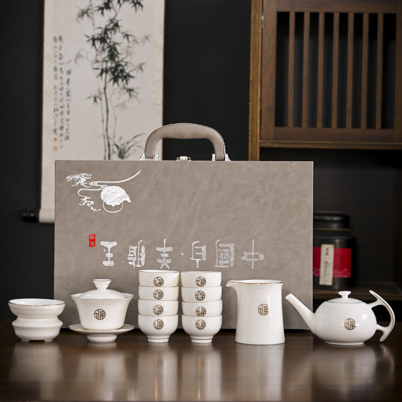 徳化羊脂玉茶器セットギフトボックス金彩白磁蓋碗茶壺茶碗業務用フルセット国潮風