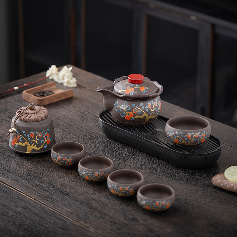 紫砂ポータブル小型セットハンドポットクイックワンポット3カップマスターカップ柿柿如意旅行ティーセットイベントギフト