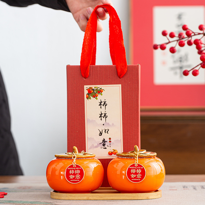 洗練された柿柿如意陶磁器柿密封缶トランペット茶葉缶結婚式喜糖お土産カスタマイズロゴ