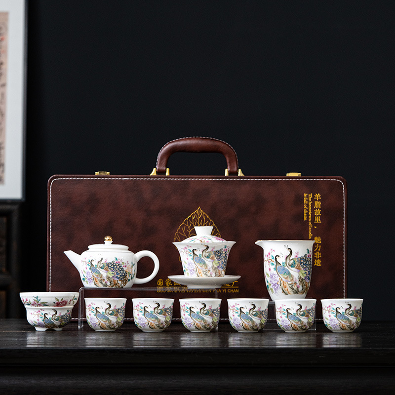 孔雀カンフー茶器セット家庭用陶磁器ホバーリング蓋羊脂玉鳳鳴壺白磁高級贅沢プレゼント