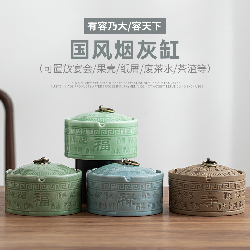 国風福禄陶磁器灰皿蓋付き創意個性ファッションオフィス防飛灰大小サイズリビング家庭用