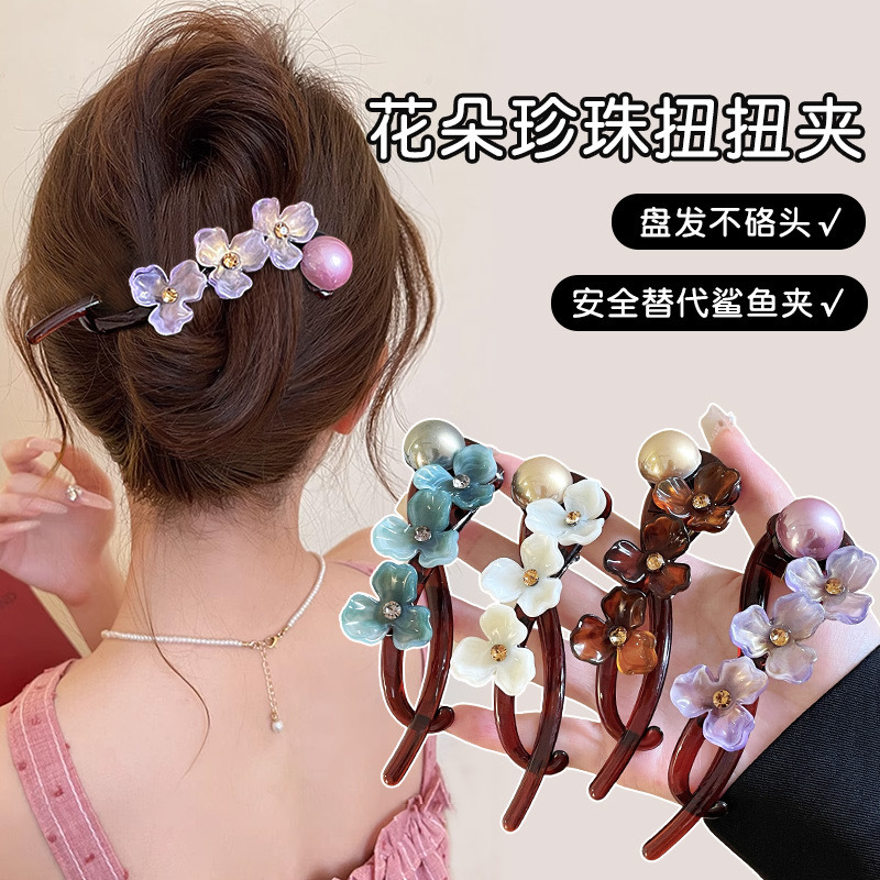髪のボリュームが豊富な女性向けフラワーパールツイストクリップ、高級感のある2025年新作後頭部レイジーヘアクリップ、ワンラインクリップ