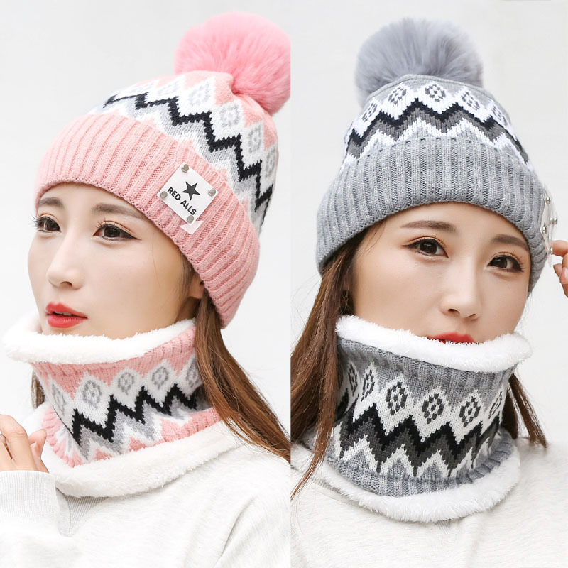 新しい冬のワンピースニット帽の女性保温帽とベルベットの厚い風雪帽子のマフラーが一体に耳を保護する毛糸帽
