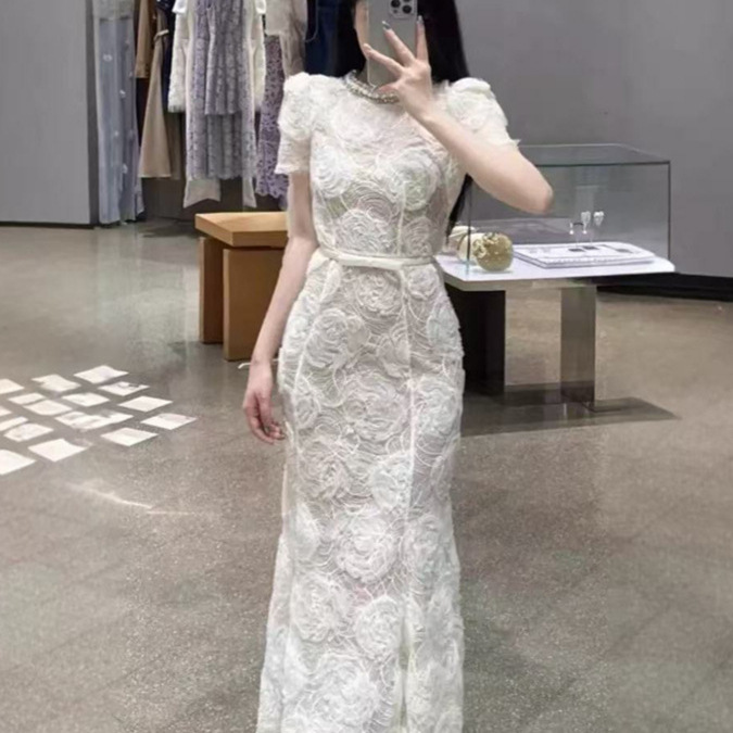 フレンチニッチ25サマーレースノースリーブベストドレスレディースサマーニューエレガント気質ウエストロングスカート