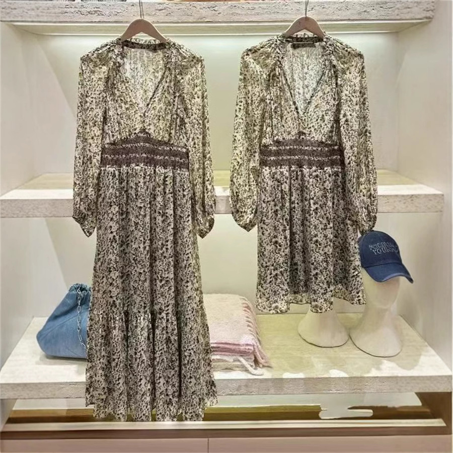 フランス式の優雅な2025春夏の新型のレトロな花が腰のvネックの長袖のワンピースの帯の上着のケーキを緩めます。