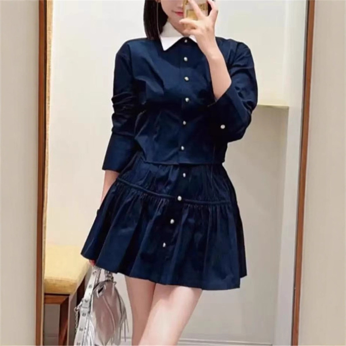 フレンチエレガント25秋冬コントラストカラースタンドカラー長袖ウエストシャツショートトップ+万能パフスカート