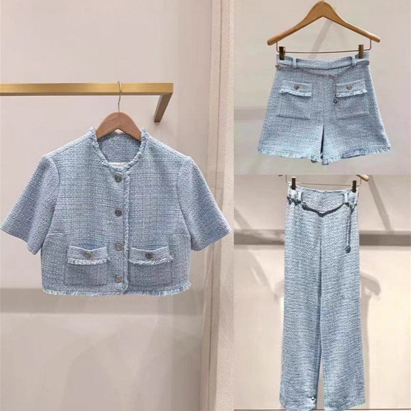 フランスの小衆2025春夏の水色の粗い花の毛の辺の半袖の上着の長い半ズボンのスーツの女性