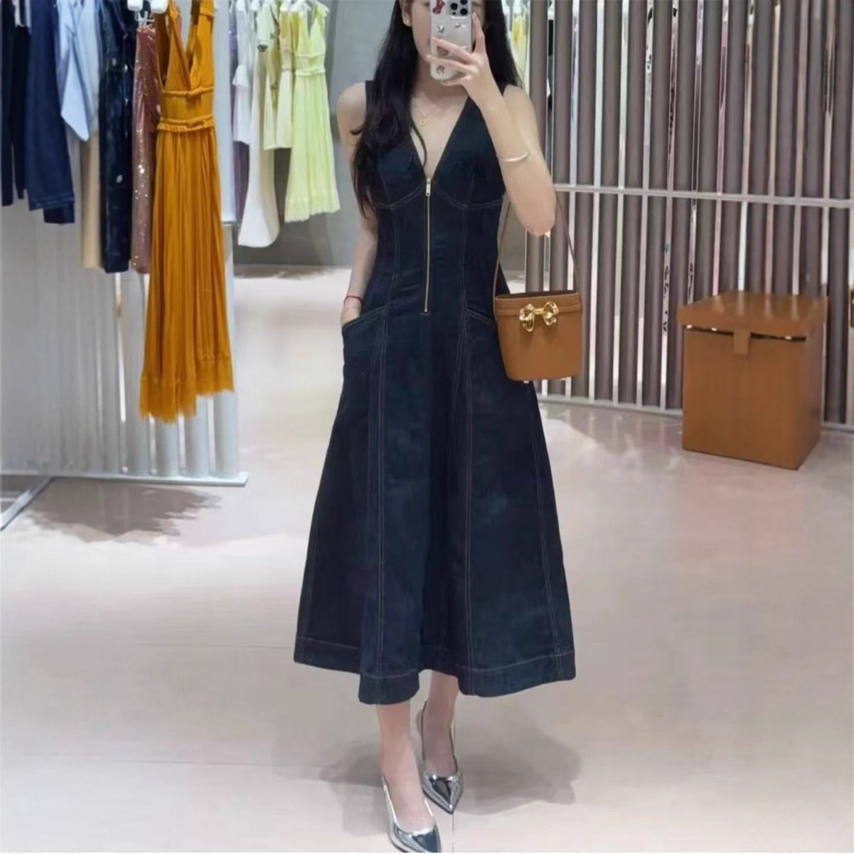 25夏新作フレンチレトロVネックウエストロングデニムスリムベストドレス