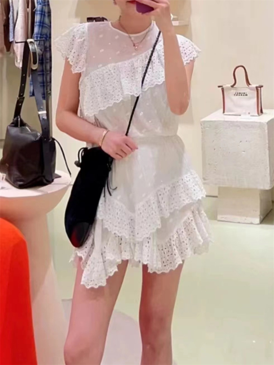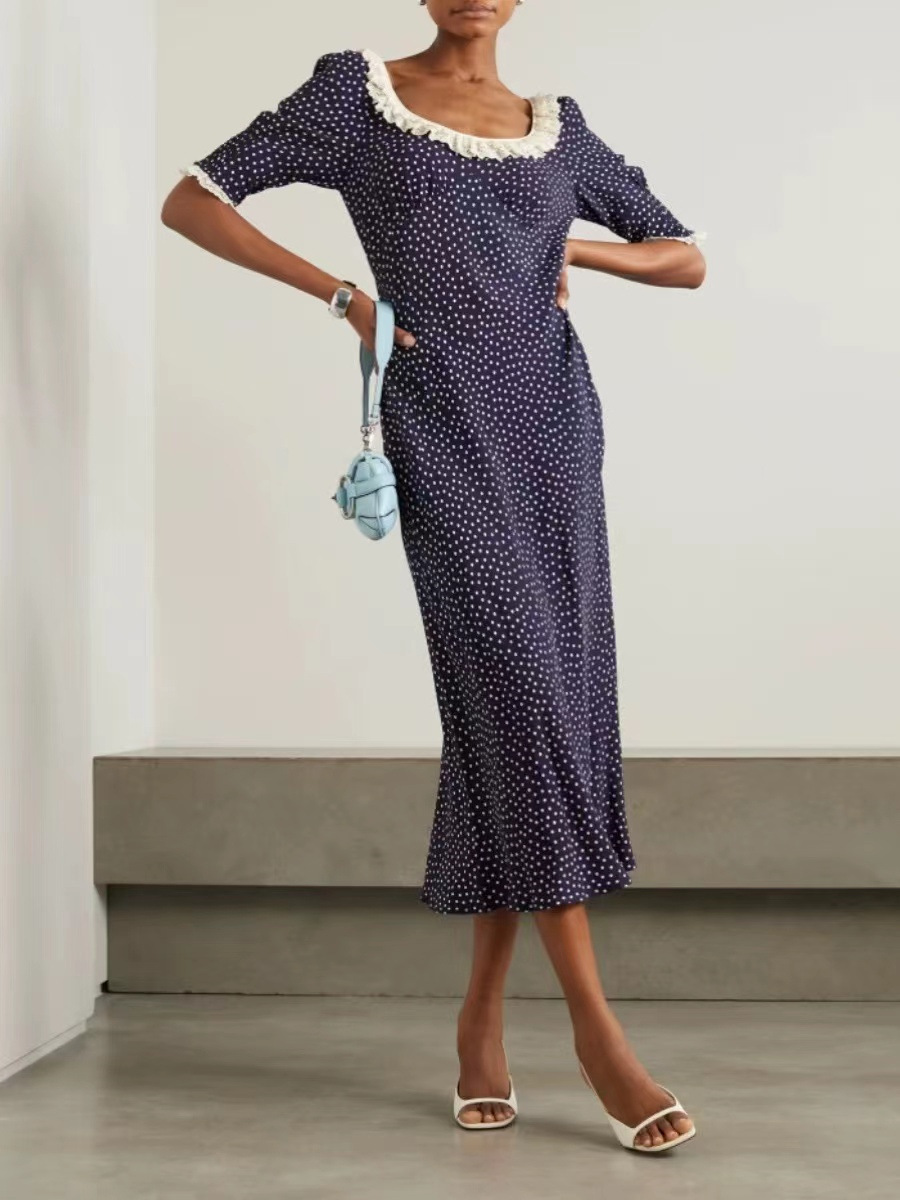 フランス式の優雅な2024夏の新型レースの縁飾りの波点の縮の中の長いワンピース