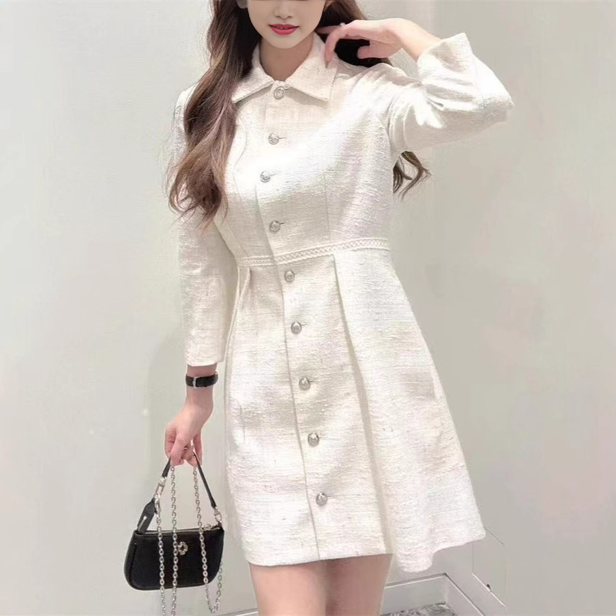 フランス式の優雅な2024秋冬の新型の婦人服の薄い色の襟をひっくり返して身を修める短いシャツ式の花のワンピース