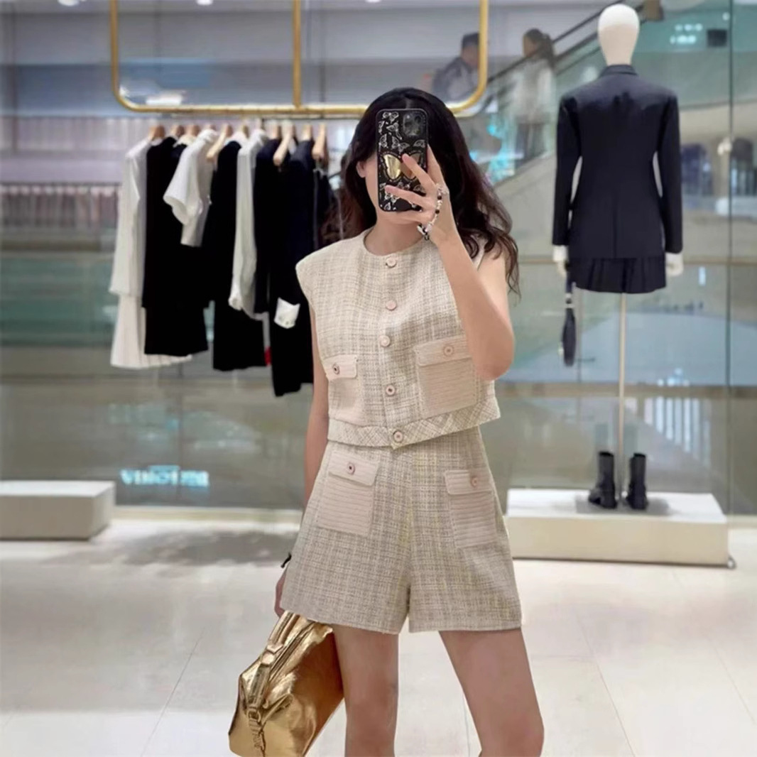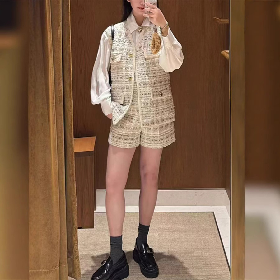 フランス式の小衆2025早春の新型の名媛はツイードのvネックの多ポケットの馬甲の半ズボンのスーツを編みます。