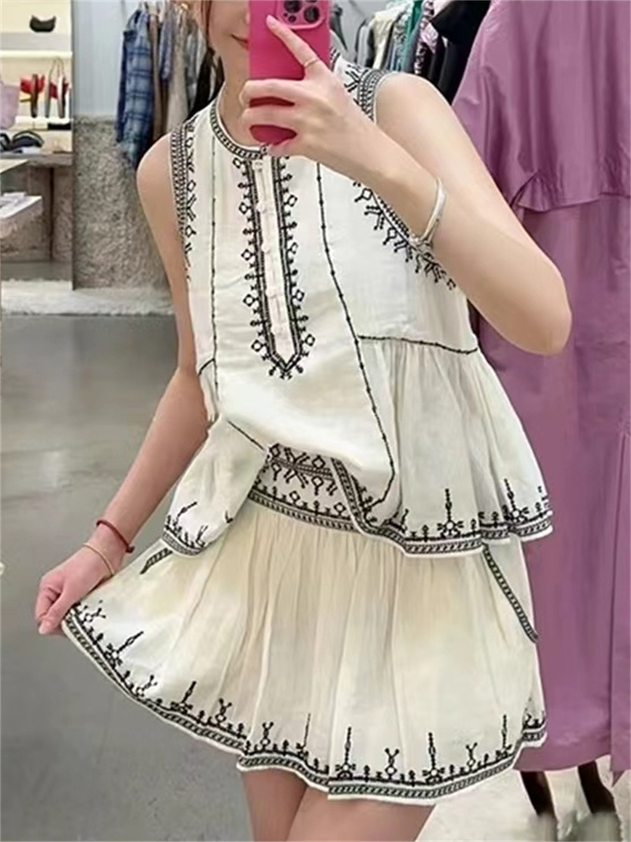 フランス式大衆24春夏新作ボヘミアンリゾート風衝突色刺繍セットベスト上着ショートスカート