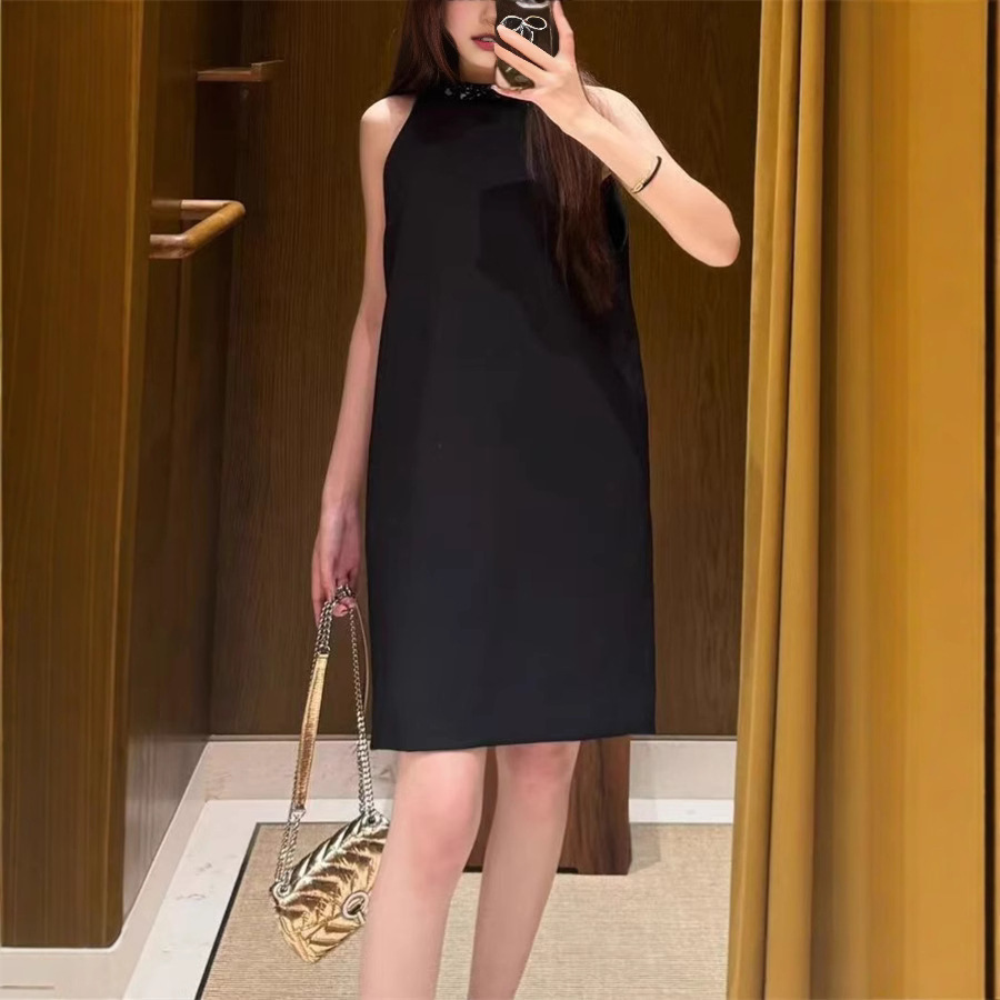 フランス式の優雅な2024秋冬の新型の女性の黒色の丸襟はビーズの切れを象眼して首の袖なしのワンピースを掛けます。