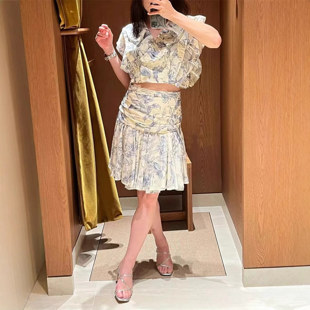 フランス式の大衆24夏の新型のハスの葉の縁の花卉のプリントの双列のボタンの短い服のシャツの上着の腰の半分のスカート