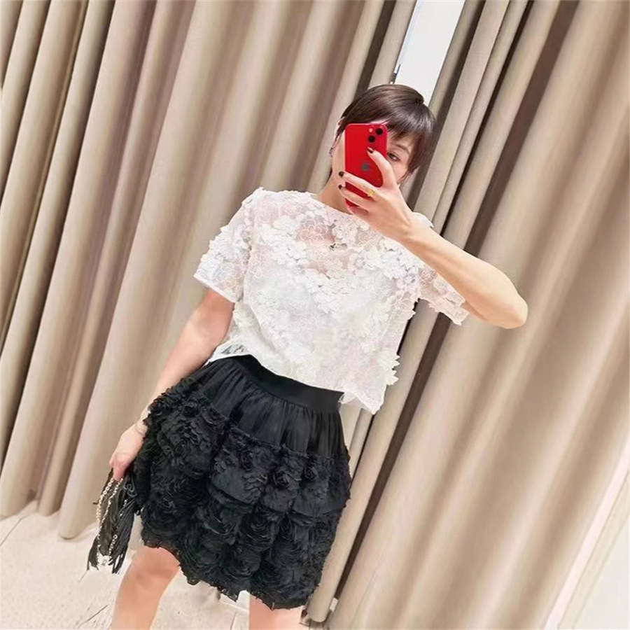 フランス式の小衆2025早春の流行の半袖の立体の小さい花の刺繍の白いかすかな透き通っている2つのセットの丸首の上着