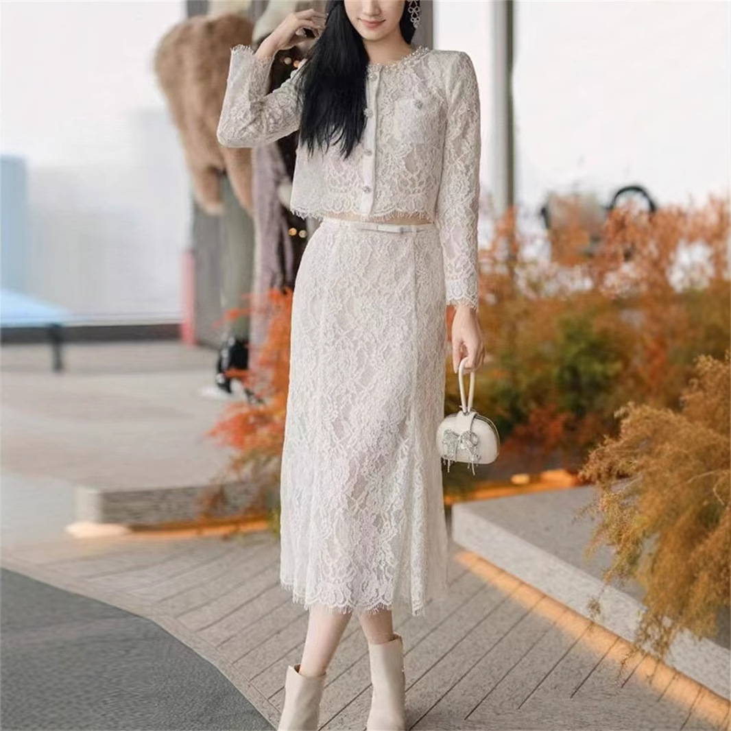 2025早春の新型フランス千金風重工ドリルはレースの上着の魚の尾の半身のスカートのスーツの女性を合わせます。