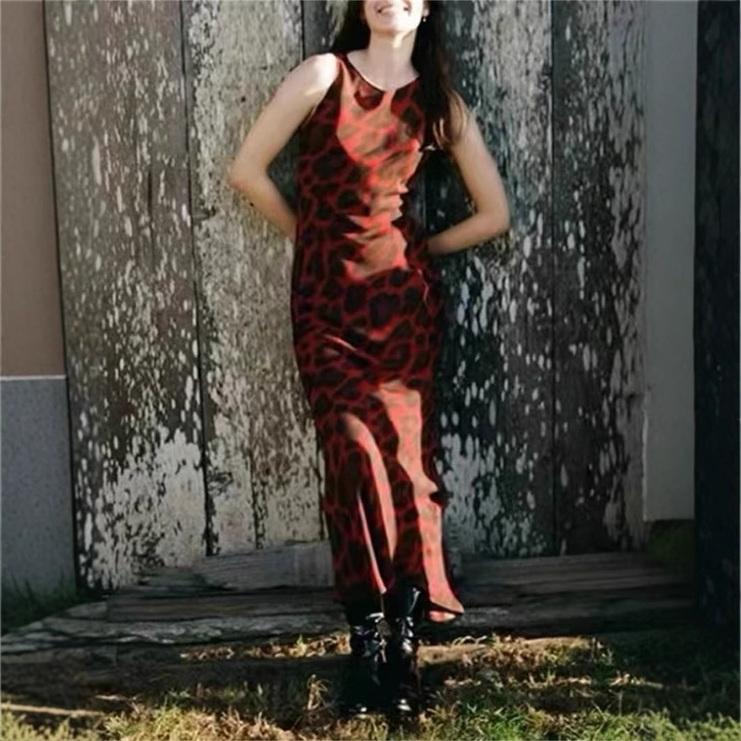 フランスの優雅な2024新型の赤いヒョウ柄のプリントのシルクのスカートのノースリーブの船の襟の斜めの裁断はやせている長いタイプのワンピースを現します。