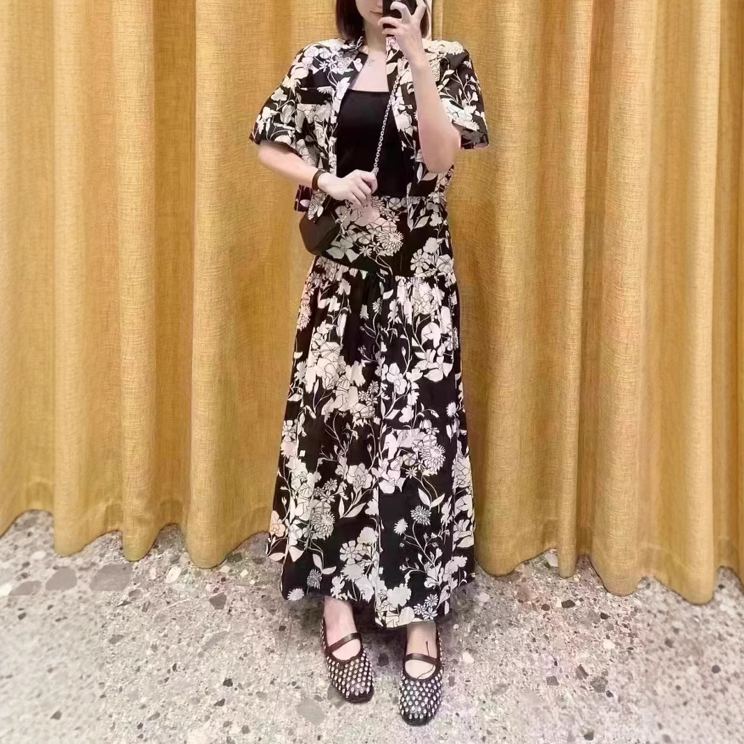 フランス式大衆2024夏の新型レトロ休暇白黒プリント襟半袖大ポケットシャツ半スカート