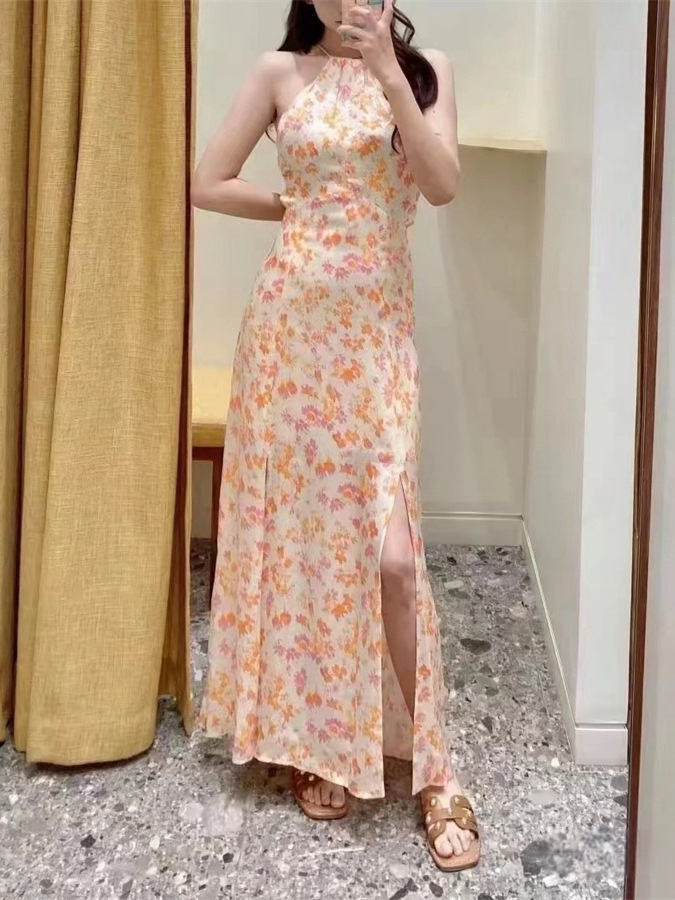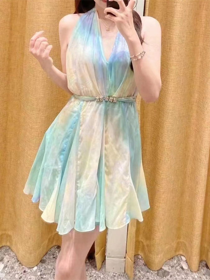 フレンチロマンチック24春夏リゾート風首掛け式ウエストグラデーション色捺染露背ノースリーブストラップワンピース