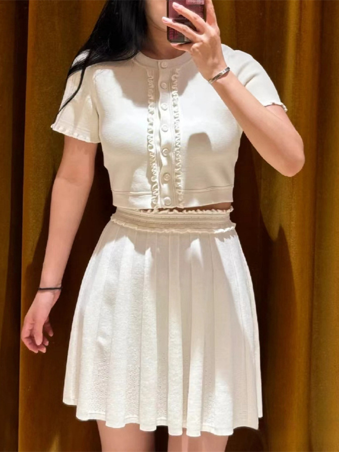 フランス式の優雅な24早秋のニットの上着の女性の丸首の木の耳元の高い腰の百タックの半身のスカートのスーツ