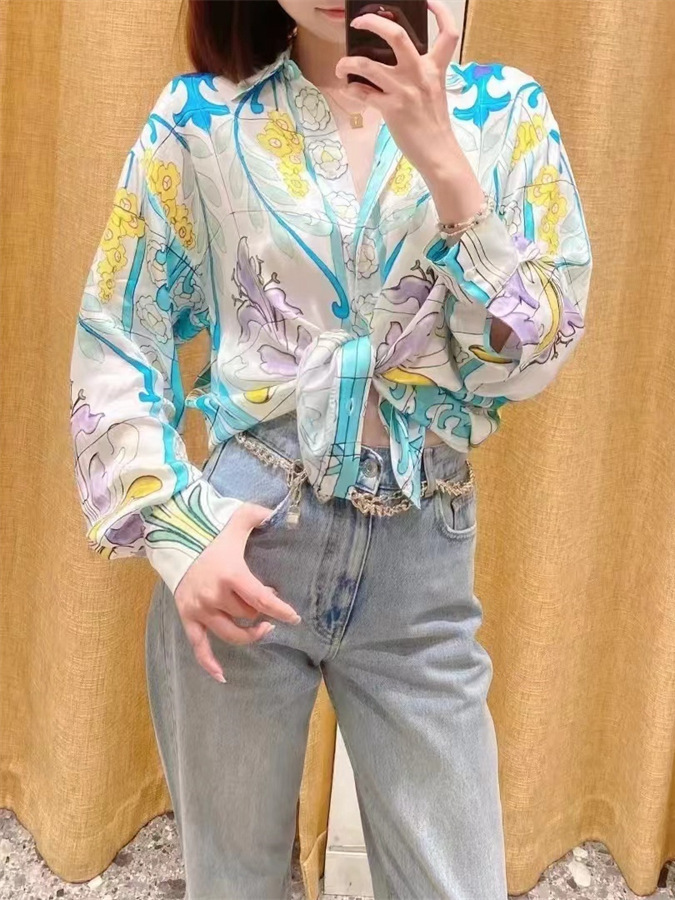 フランス式大衆24春夏リゾート風植物花プリント落肩長袖シャツ上着