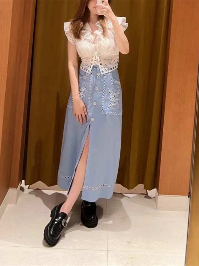 フランス式の優雅な24夏の新型の透かし彫りの花の刺繍の単列のボタンのポケットのスリットのスカート