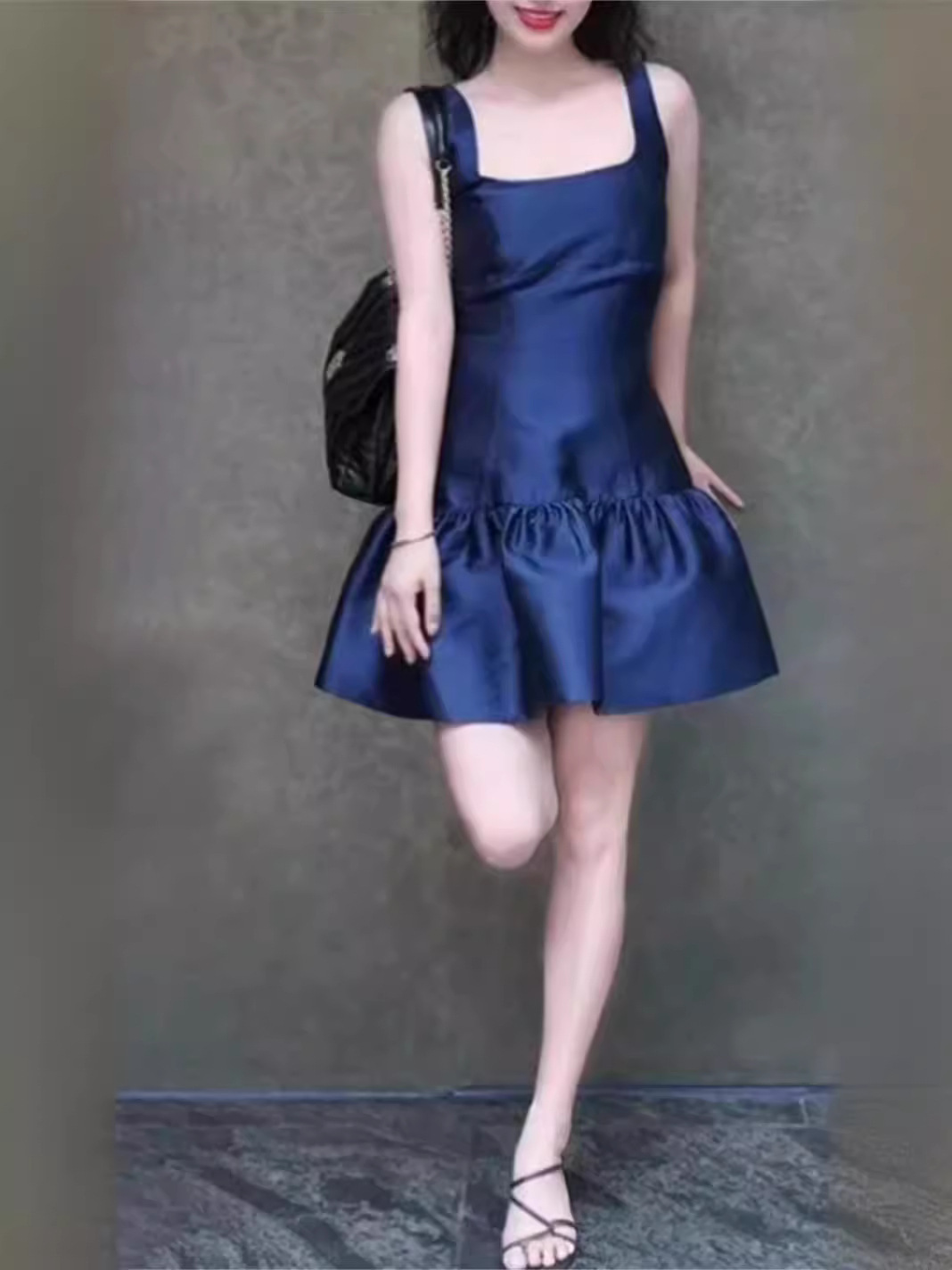 フランス式の優雅な2024早秋の光沢感のあるハスの葉の縁の袖のない方の襟のガーターの露背のスカートのベストのスカート