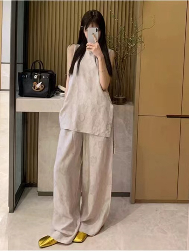 新中国風ジャカードサテンゆるいファッション上着ベスト女性ワイドパンツセット夏新作