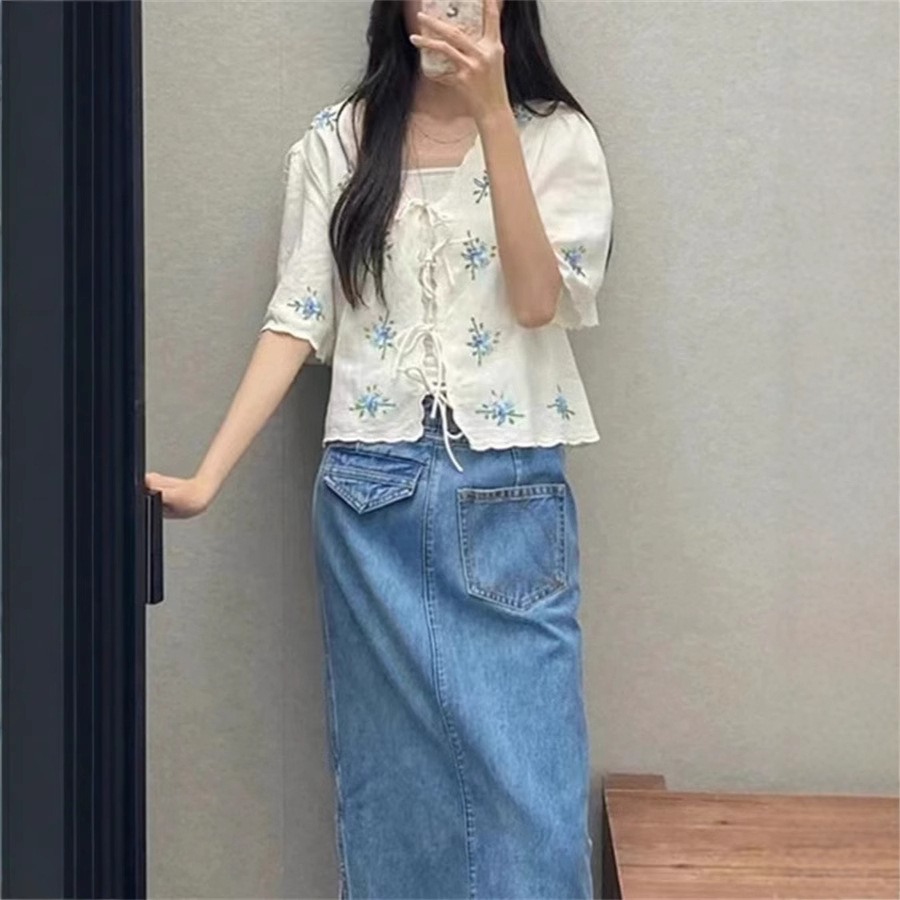 大衆デザイン24春夏新作刺繍vネック半袖精緻上着百合フレンチロマンチック上着日常通