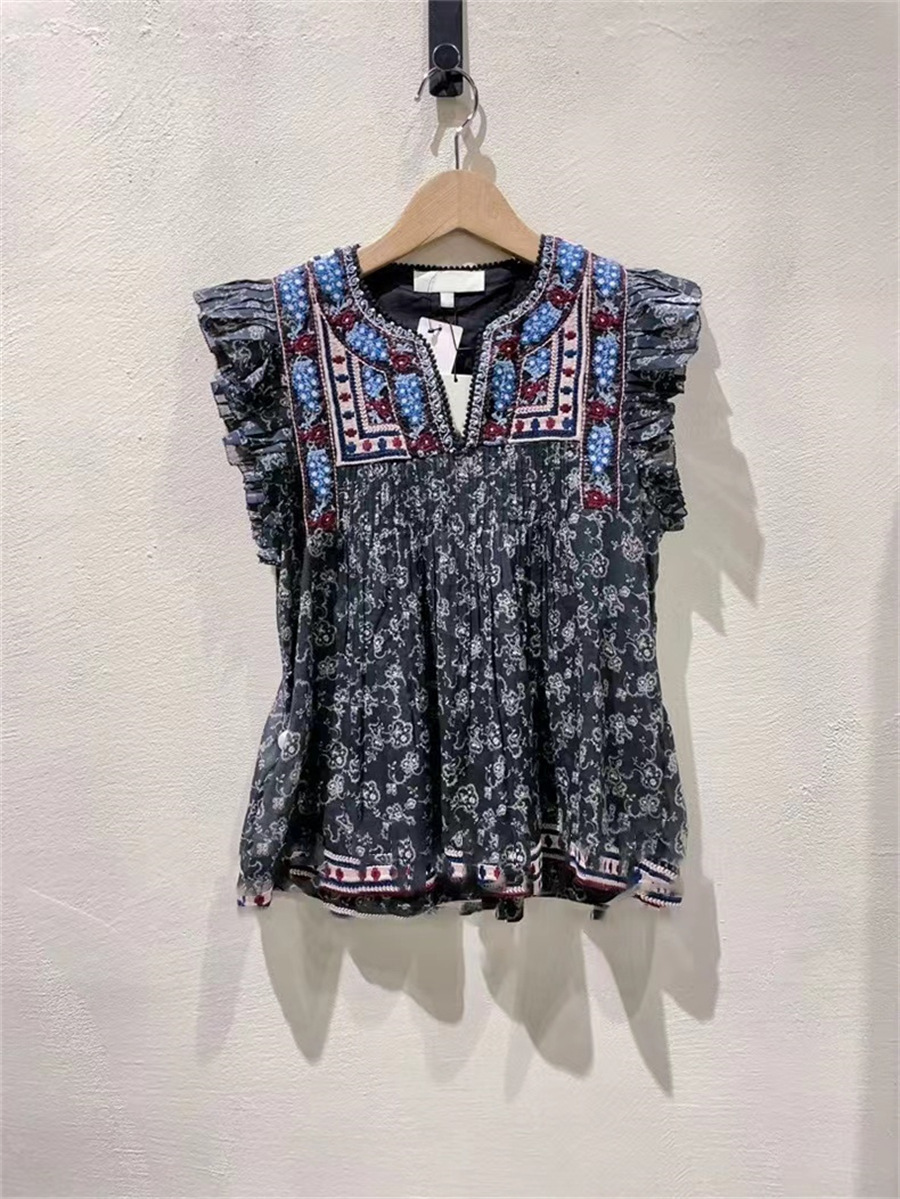 フランス式小衆2024夏新作田園プリントレトロ刺繍減齢飛袖ベスト上着女