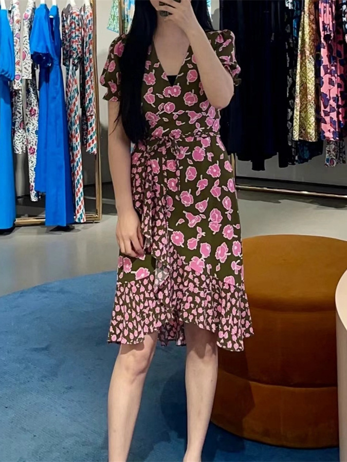 フランス式の優雅な24春夏の新型オリーブの緑のバラの花の言葉のお茶の休みのスカートのつぼみの袖のワンピースのvネックの包み