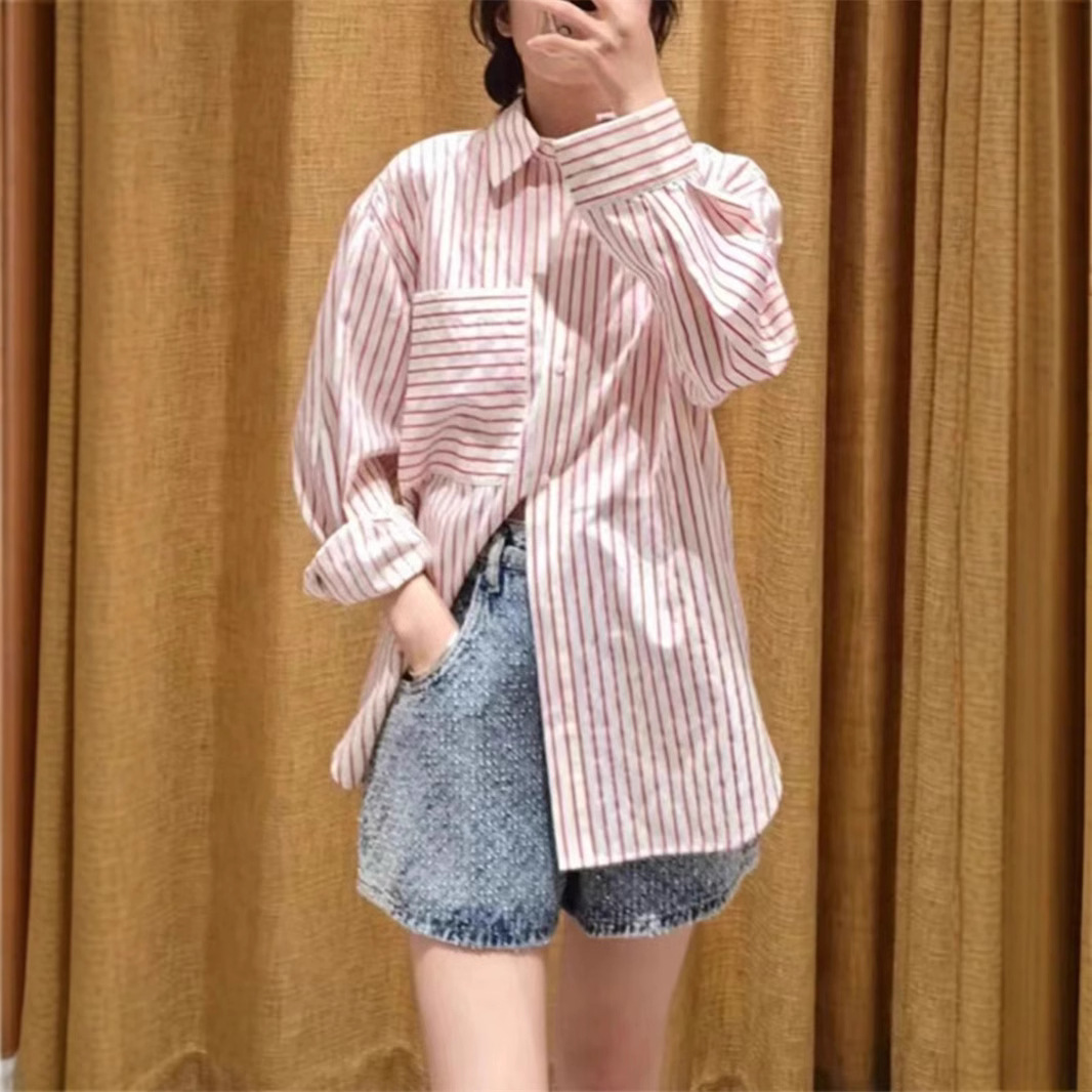 フランス式小衆2024早秋ファッションカジュアル大ポケットピンクの縞模様のホットドリル長袖英倫風シャツ女