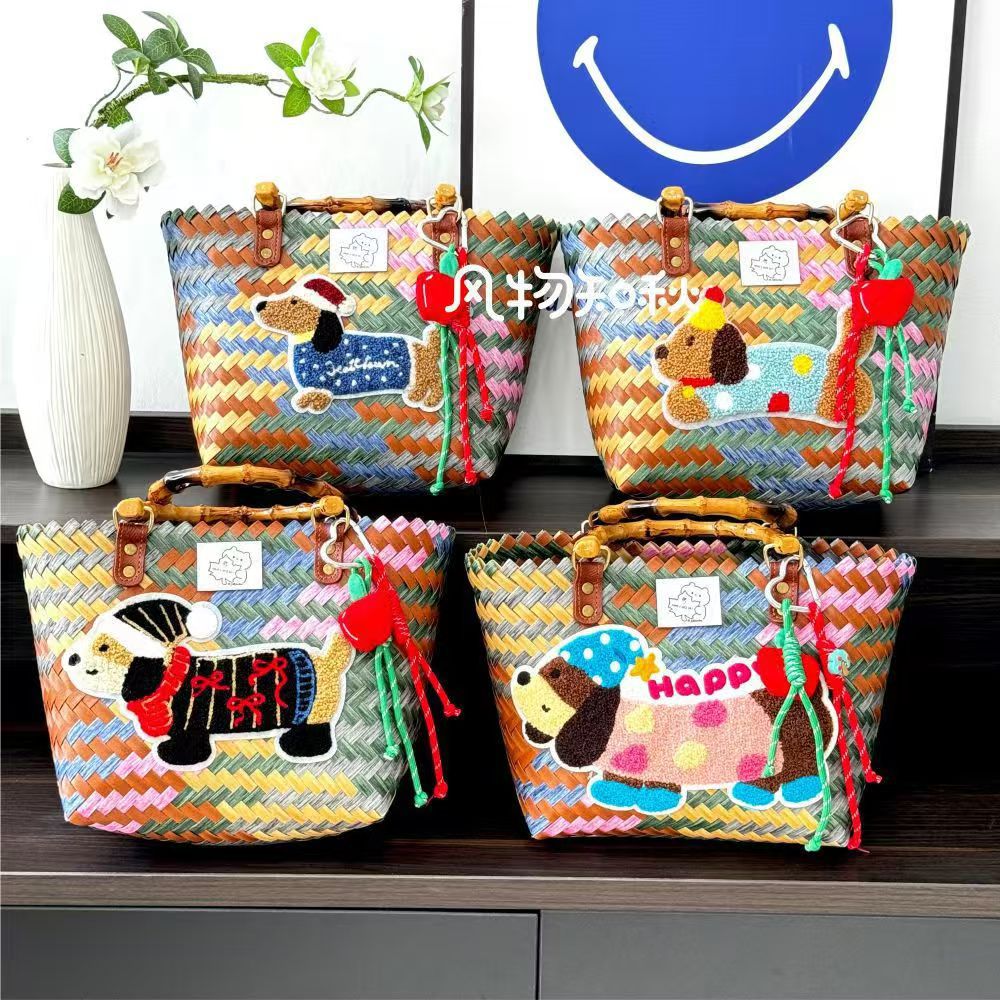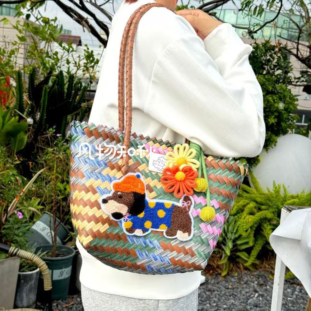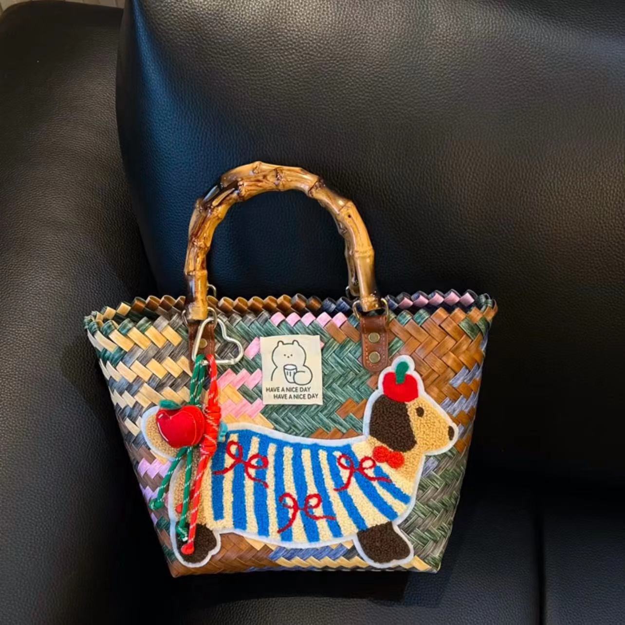 ストライプのレトロなダックスフンド編み手織り野菜バスケット2024新作ペンダント編みハンドバッグ収納アーティファクト