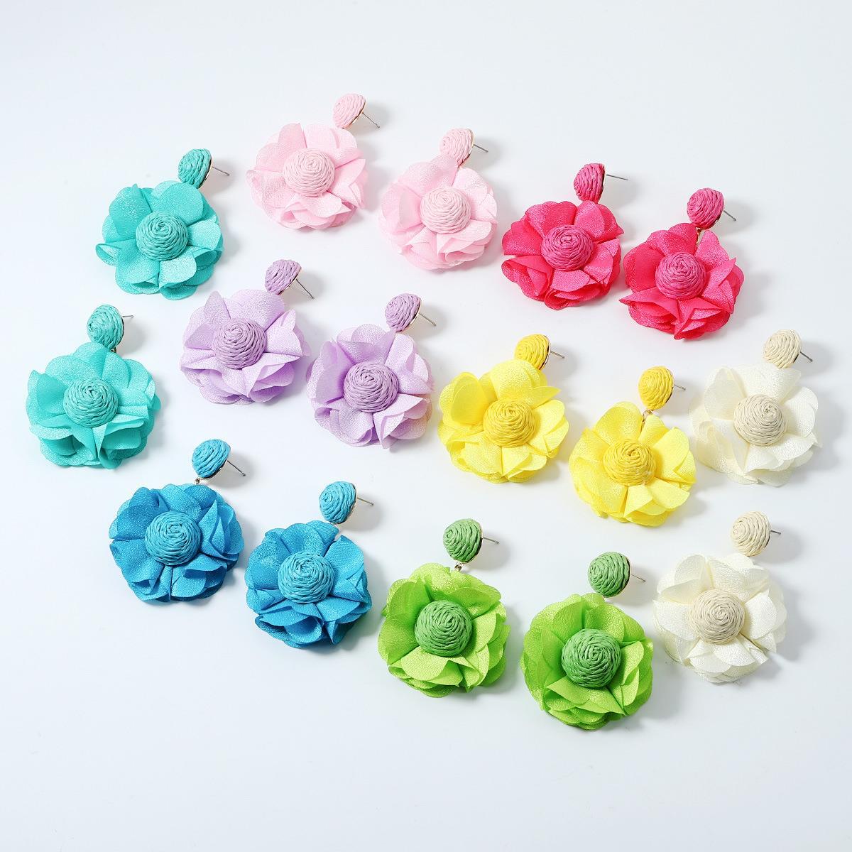 ボヘミアン風ラフィーバー編み花型イヤリング夏小清新茶系イヤリングネット紅気質耳飾品