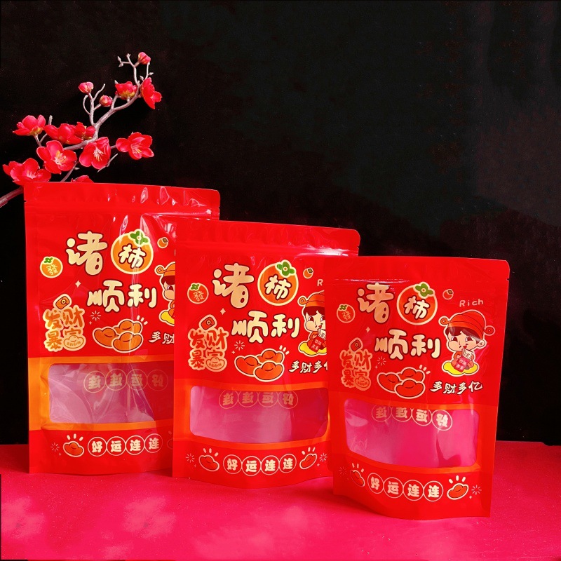 諸柿は順調に年用品をプレゼントします。赤い密封袋の喜糖スナックの干物ナッツ食品の自封袋です。