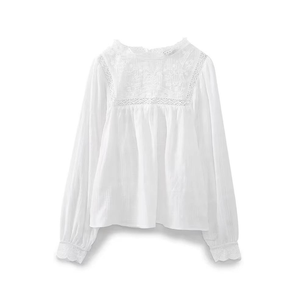 ヨーロッパとアメリカのクロスボーダー婦人服卸売女性スタンドカラーレースジャカードルーズ長袖シャツトップ
