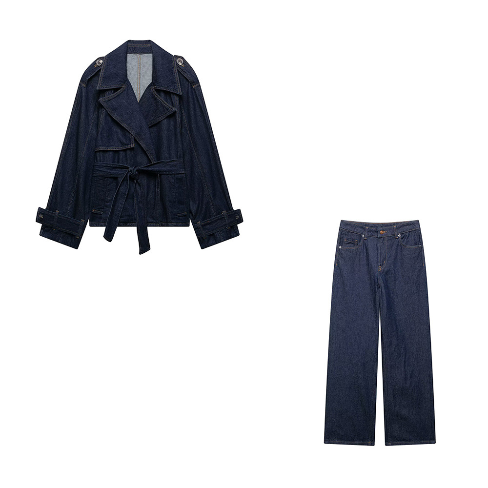 ヨーロッパとアメリカのクロスボーダー婦人服卸売女性のフレンチブルーベルトショートワイドバージョンデザインデニムウインドブレーカーHMハイウエストワイド