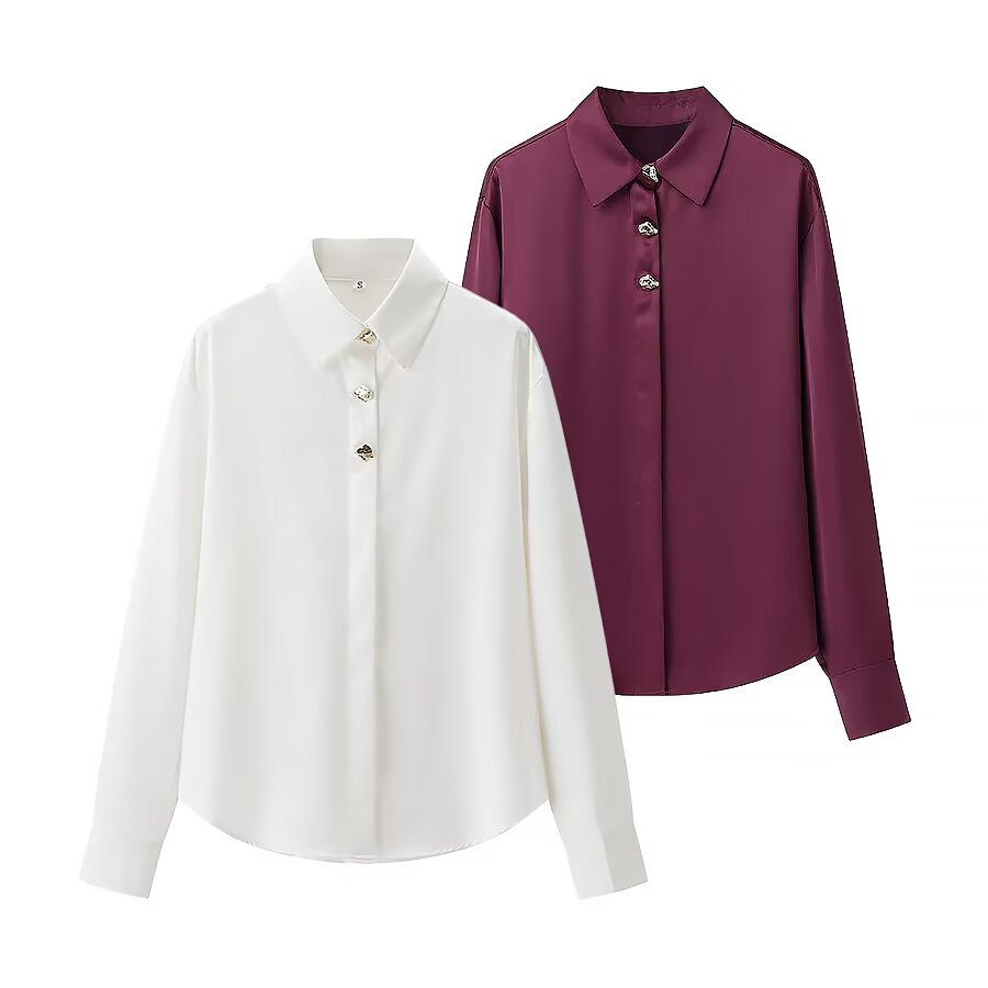 ヨーロッパとアメリカのクロスボーダー婦人服卸売女性のゴールデンボタン装飾シルクサテンシャツ