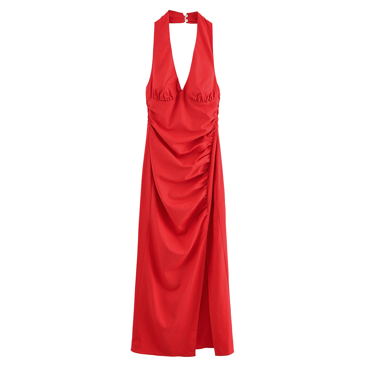 ヨーロッパとアメリカのクロスボーダー婦人服卸売女性リネンプリーツホルターネックミディドレス
