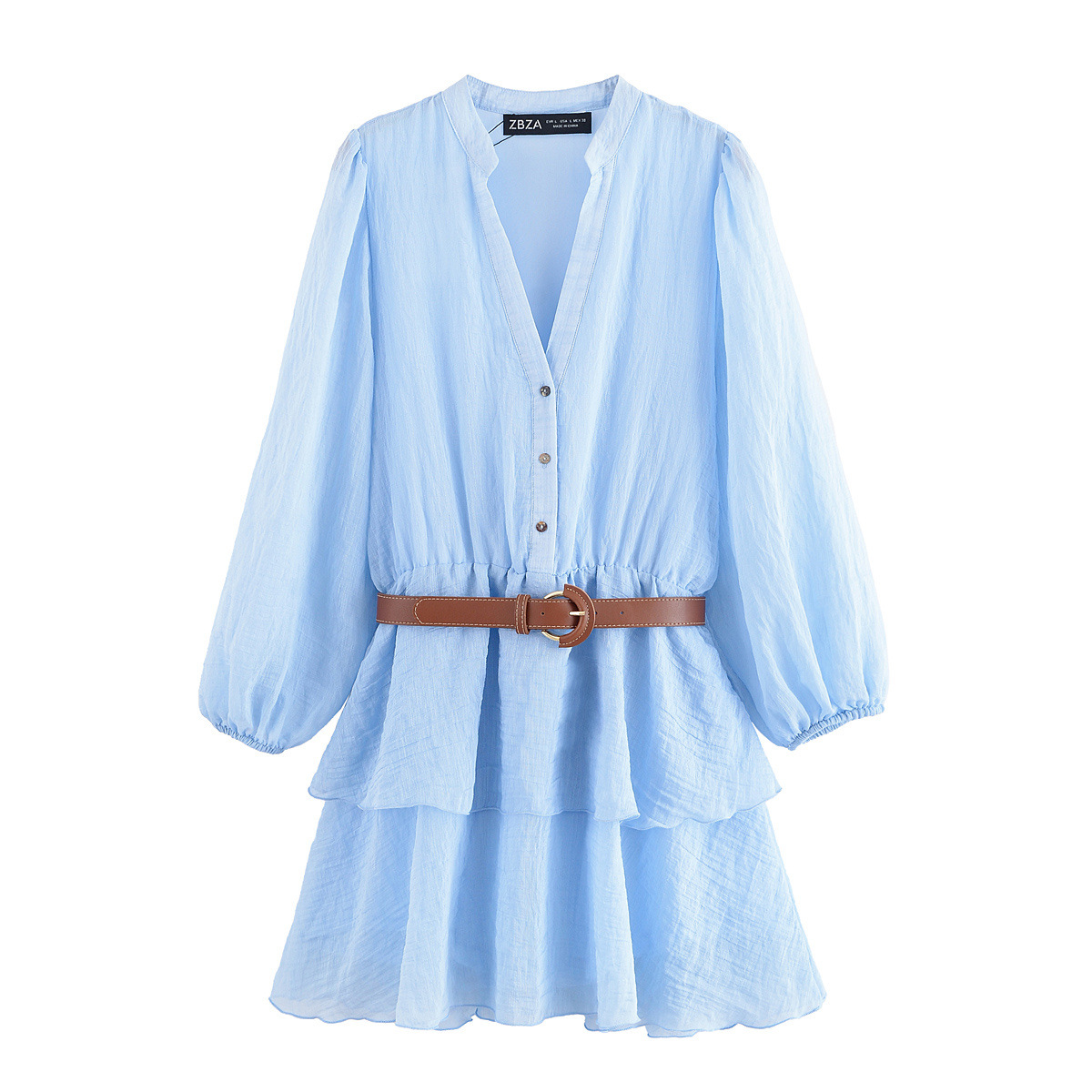 ヨーロッパとアメリカのクロスボーダー婦人服卸売女性ベルト付きスタック装飾 V ネック長袖ドレス