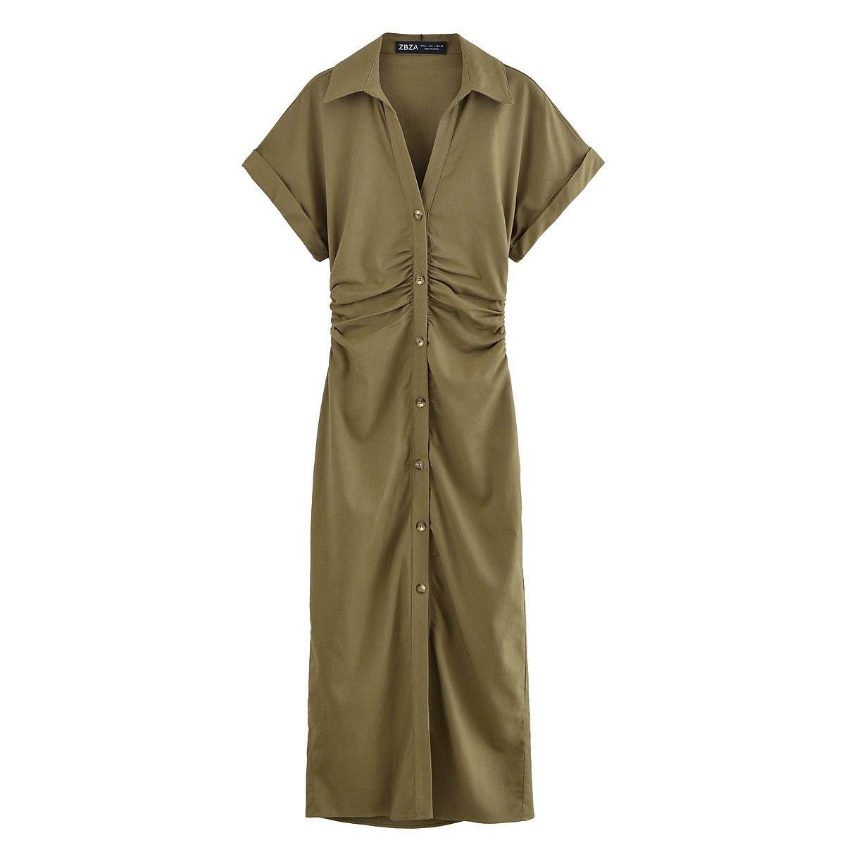 ヨーロッパとアメリカのクロスボーダー婦人服卸売女性リネン半袖ラペルミディドレス