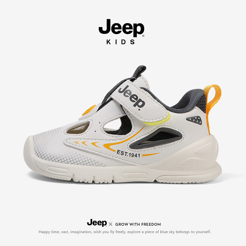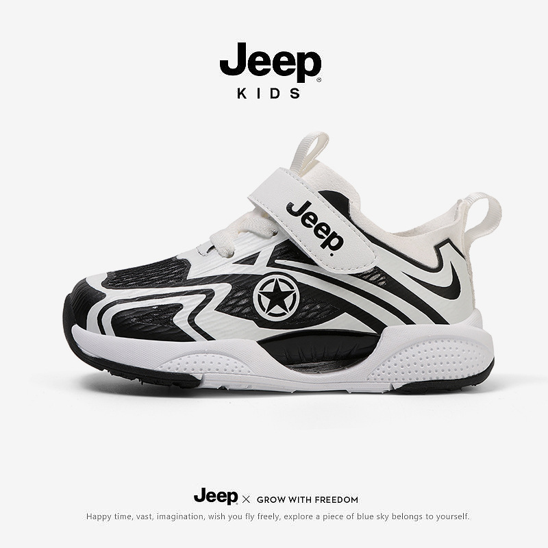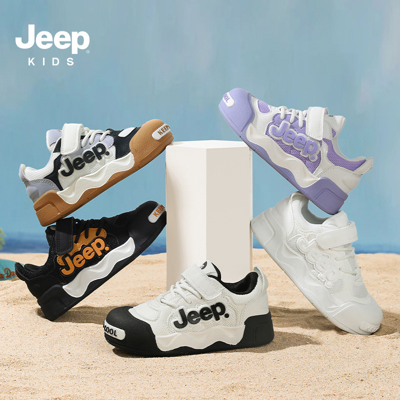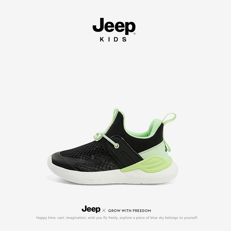 Jeepは男の子の運動靴2025夏のシングルネットの透かし彫りのランニング靴の新型の柔らかい底の子供のネットの靴を踏んでいます。