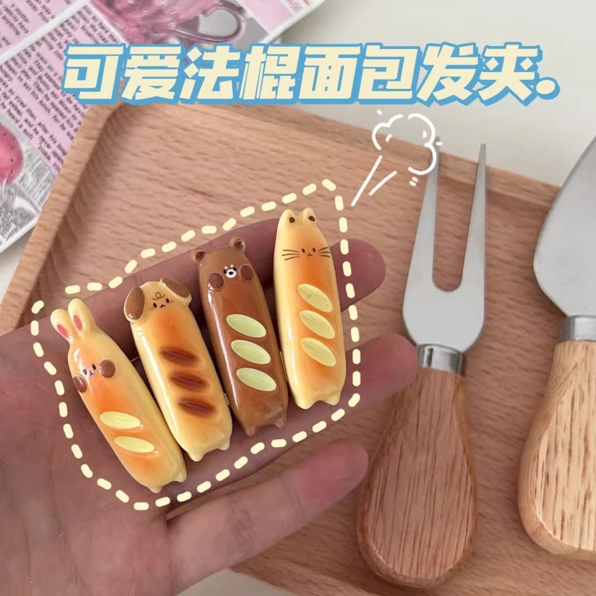 趣味のキャラクターのフランスの棒のパンは食べ物をシミュレーションして髪を挟みます。